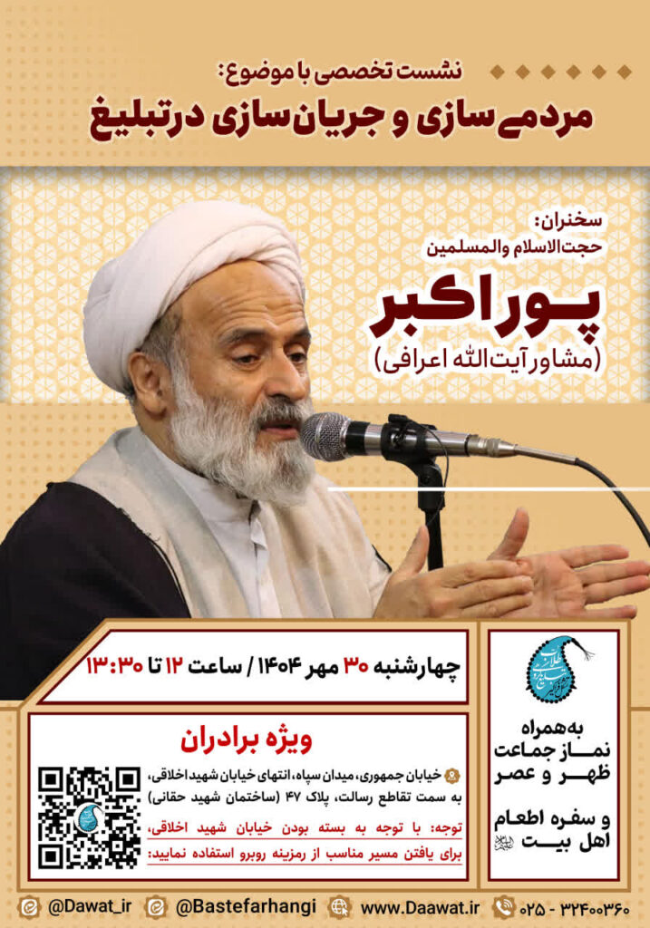 نشست تخصصی مردمیسازی و جریانسازی در تبلیغ برگزار میشود🔸 موضوع نشست: مردمیسازی و جریانسازی در تبلیغ🔸 ارائهدهنده: حجةالاسلام والمسلمین پور اکبر، مشاور آیتالله اعرافی🔸 زمان برگزاری: چهارشنبه، 30 مهر 1404، ساعت 12:00 تا 13:30🔸 مکان برگزاری: تشکل فراگبر تشکل فراگیر گروههای تبلیغی کشور این نشست تخصصی را با هدف بررسی اهمیت و روشهای مؤثر مردمیسازی […]
