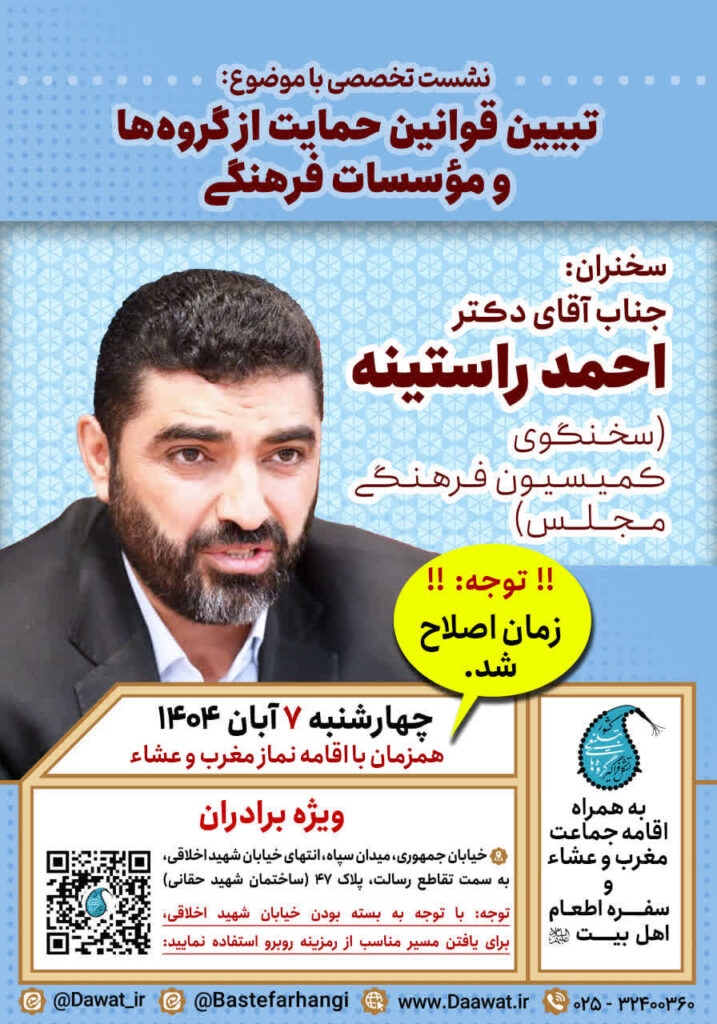 📢 نشست تخصصی «تبیین قوانین حمایت از گروهها و مؤسسات فرهنگی» برگزار میشود به گزارش واحد خبری تشکل فراگیر گروههای تبلیغی کشور، نشست تخصصی این هفته با موضوع «تبیین قوانین حمایت از گروهها و مؤسسات فرهنگی» برگزار میشود. در این نشست، جناب آقای دکتر احمد راستینه، سخنگوی کمیسیون فرهنگی مجلس شورای اسلامی، بهعنوان سخنران اصلی […]